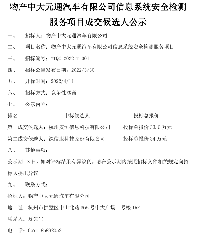 物产中大元通汽车信息系统安全检测服务项目成交候选人公示