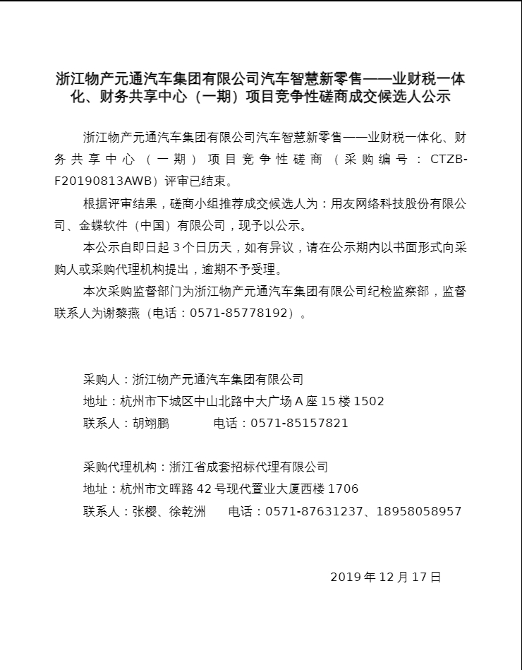 汽车智慧新零售--业财税一体化、财务共享中心(一期)项目竞争性磋商成交候选人公示